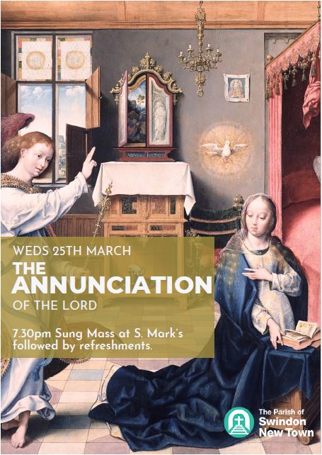 Wednesday 25 March is the Solemnity of the Annunciation of the Lord, when we remember Our Lady’s resounding “yes” to the message of the angel.  There will be a said Mass at S. Augustine’s at 10am and a Sung Mass at S. Mark at 7.30pm, followed by refreshments.
